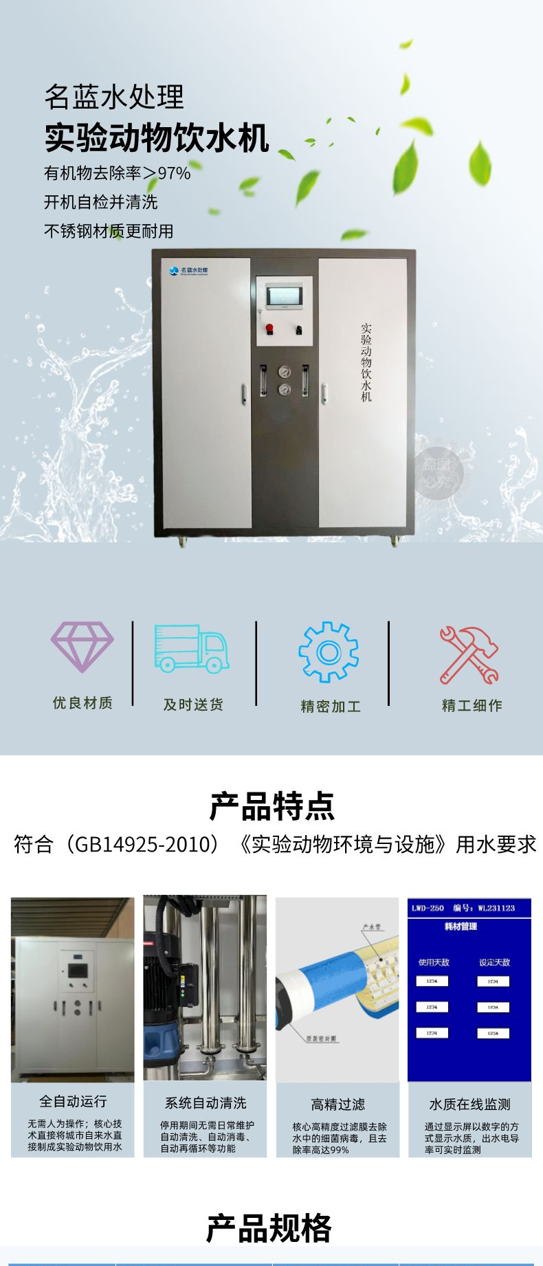 1.先进:全自动运行,无需人为操作;城市自来水进水,通过多级过滤,核心技术采用美国杜邦技术直接将直接制成.实验动物饮用水细菌/病毒/去除率高达99%